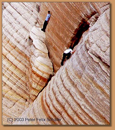 Wir waren gerade dabei, in den nördlichen Coyote Buttes, nahe bei der Second Wave, zum Top Rock Plateau hochzusteigen. Die Route ist hier zwar steil, für trittsichere Wanderer aber gefahrlos machbar. Nach ca. 2/3 der Strecke wichen wir ein Stück nach links aus, um auf die interessante Ebene direkt oberhalb der Wave hinabzublicken. Von einem Vorsprung beobachteten wir dann mit dem Fernglas ca. eine halbe Stunde lang eine Szene, in die wir leider nicht helfend eingreifen konnten.