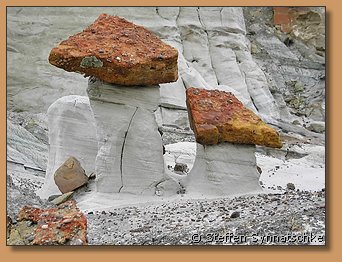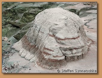 Der Abstieg hinab ins Tal gestaltete sich äußerst schwierig. An vielen Stellen fiel der Fels fast senkrecht ab, keine Chance da (gesund) hinunter zu kommen. Einsetzender Regen kam erschwerend hinzu und machte das ganze Unternehmen noch gefährlicher. Nach einigem Suchen fanden wir endlich eine geeignete Stelle, eine Art Sanddüne auf der wir sanft nach unten "glitten". Auf halber Höhe, quasi auf den Köpfen der "Soldaten", gingen wir auf eine erste Entdeckungstour. Geschützt in den Nischen des Canyons standen hier immer wieder große und kleine Hoodoos, die denen aus dem Wahweap Drainage und dem White Valley sehr ähnlich sahen. Kein Wunder, ist doch das Material das Gleiche. Darunter waren so grazile Gestalten, wie The Pretty oder The Sweeties, die beide sicherlich einen Preis gewinnen würden, gäbe es so etwas wie die "Miss-" oder "Mister Hoodoo" Wahl. Die Krönung (für mich) war aber der Doppelhoodoo auf der Spitze eines Berges. Leider hatte der eine schon seine Mütze verloren, so sieht das Gebilde aus wie ein Vikingerhelm nach überstandenem Kampfeinsatz ;-)